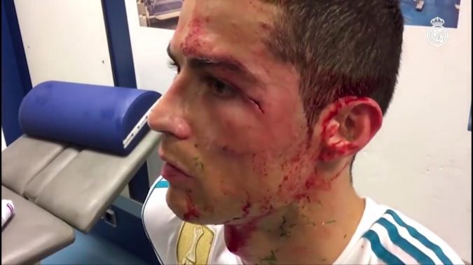 Cristiano Ronaldo sufrió una patada en la cara que lo obligó a abandonar el campo de juego. Si bien el golpe no le causó una lesión que le impidiera jugar los próximos partidos, sí provocó una herida que bañó su rostro de sangre. El corte se produjo al costado de su ojo izquierdo.