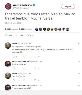 Varios equipos extranjeros, donde militan jugadores mexicanos, mandaron mensajes de apoyo. La cuenta en español del West Ham de Inglaterra fue una de las primeras en reaccionar ante el fenómeno natural.