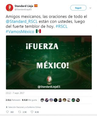 El Standard de Lieja, club en el que juega el portero Guillermo Ochoa, fue otro de los equipos europeos en mandar oraciones. Publicó en su cuenta oficial de Twitter: «Fuerza México. Amigos mexicanos, las oraciones de todo el @Standard_RSCL están con ustedes, luego del fuerte temblor». Una imagen del Ángel de la independencia ilustra el mensaje.