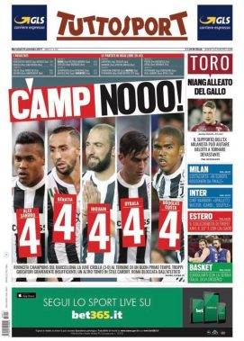 El nombre del estadio del Barcelona se convierte en «Camp Nooo» en la portada del diario turinés «Tuttosport». Medio que habla del «tropiezo al estilo Cardiff» de la Juventus. Asimismo lamenta las «demasiadas insuficiencias graves» en las actuaciones de sus futbolistas.