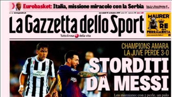 La «Gazzetta dello Sport» en su portada destaca «Messi aturde a la Juventus» y que la ilusión dura solo 45 minutos en el cuadro «bianconeri». El medio italiano define al astro argentino como un «marciano» porque que firmó «dos perlas», un palo (estrelló balón poste) y una gran actuación (pase gol Rakitic).