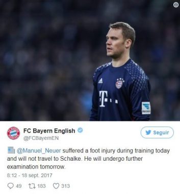 Neuer, quien el 26 de agosto regresó al marco tras cuatro meses lesionado, sufrió hoy una lesión durante el entrenamiento.»Este martes el guardameta será sometido a nuevas pruebas médicas», publicó el club en su cuenta oficial de Twitter.