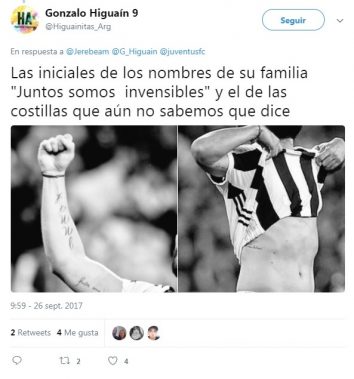 El delantero de la Juventus, el argentino Gonzalo Higuaín, sobresalía entre la mayoría de los futbolistas porque en su cuerpo no tenían ningún tatuaje. Sin embargo, ahora tiene cuatro.