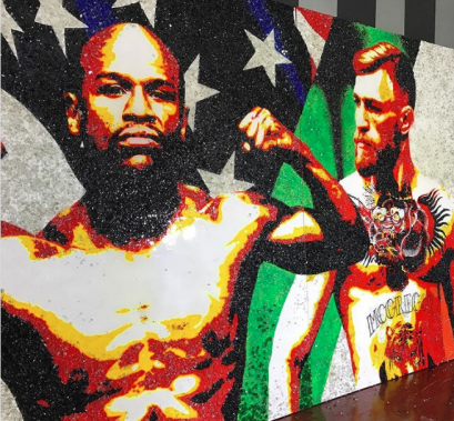 La imagen gigante, que sorprendió a los seguidores de Mayweather en las redes sociales, es obra de la artista Tiffanie Anderson, conocida como «The Pretty Artist», quien hizo las ilustraciones a base de vidrio quebrado y muestra a ambos peleadores con sus poses características, delante de las banderas de sus respectivos países.