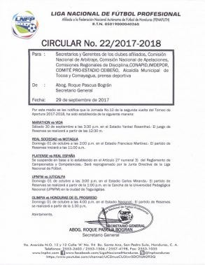 La Liga Nacional confirmó este día la fecha y horario de los partidos de la jornada número 10 del torneo Apertura 2017-2018. La única novedad es que el encuentro entre Platense y Real España será reprogramado.