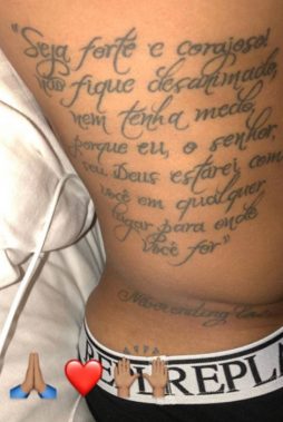 «Sé fuerte y valiente. No te desanimes, ni tengas miedo porque yo, el señor, tu Dios, estaré contigo en cualquier lugar para ti», reza en brasileño el nuevo tatuaje de Neymar.
