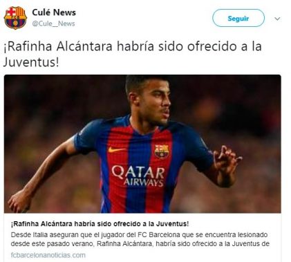 Mientras se recupera de una segunda operación en el menisco interno de la rodilla derecha, Rafinha Alcántara está en la agenda de varios clubes de cara al próximo mercado de fichajes. De acuerdo a la información del portal italiano Sport Mediaset, el jugador ha sido ofrecido a la Juventus.