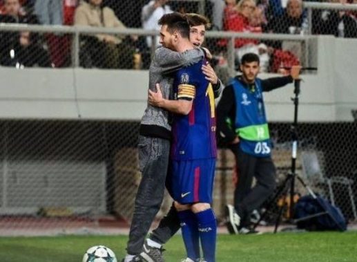 Un aficionado griego saltó las vallas de seguridad del estadio del Olympiacos para abrazar y besar a Messi.