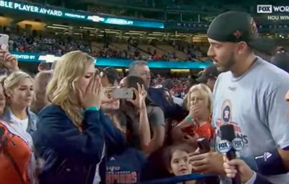 Lo hizo en pleno terreno del Dodger Stadium y en medio de la celebración por la victoria de su equipo contra los Dodgers de Los Ángeles, en el séptimo partido que les dio la Serie Mundial por primera vez en 55 años.
