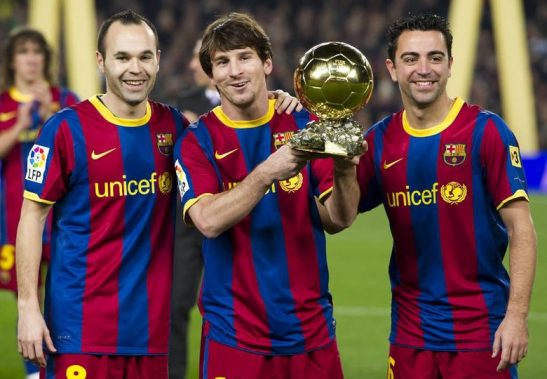 A Messi le queda para alcanzar a Iniesta, 642 encuentros, y los 767 con que cerró su carrera Xavi Hernández. Ambos canteranos como él, que le acompañaron en el podio del Balón de Oro de 2010.
