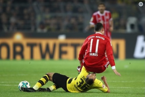 Durante el partido Borussia y Bayern, los fotógrafos tomaron una imagen que involucra a James y al defensor Topra