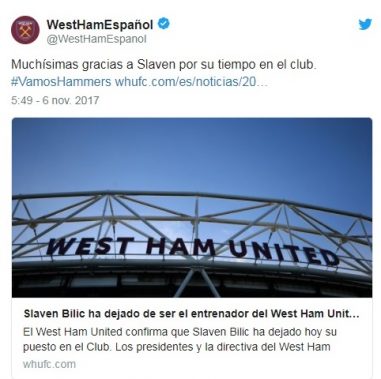 «El West Ham United puede confirmar que Slaven Bilic ha dejado hoy su puesto en el club», indicó el equipo en un comunicado. La directiva considera que «es necesario un cambio a fin de que el club marche de manera positiva y de acuerdo con sus ambiciones».