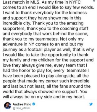 Último partido en la MLS. Mi etapa en el NY FC llega a su fin y quiero decir algunas palabras. Quiero agradecer a todo el mundo por la amabilidad y el apoyo que me ha demostrado en esta increíble ciudad. Gracias a los increíbles aficionados, al equipo de entrenadores y todos los que trabajan detrás, gracias a mis compañeros. No solo mi aventura en NY llega a su fin, también mi carrera como jugador de fútbol, por eso es por lo que me gustaría agradecer a mi familia y mis hijos por el apoyo y el amor que siempre me dan, a todos los equipos para los que tuve el honor de jugar, a cada compañero con los que he jugado, a toda la gente que ha hecho mi carrera tan increíble y por último pero no menos importante, a todos los aficionados alrededor del mundo que siempre me apoyaron. Siempre estaréis en mi corazón.