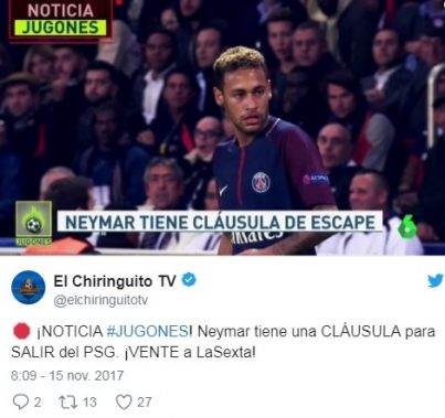 La noticia apunta a una cláusula pactada con el PSG, por la que Neymar podría abandonar el club a cambio de 222 millones de euros, los mismos que le valieron para salir del Barcelona.