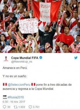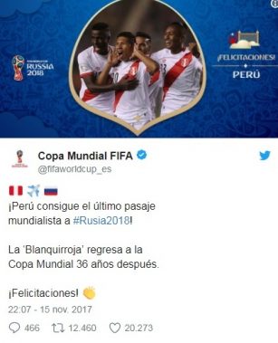 Mediante su cuenta de Twitter, la FIFA destacó que el equipo peruano haya logrado «el último pasaje mundialista» y el retorno de la selección bicolor a una Copa del Mundo, luego de 36 años de ausencia.