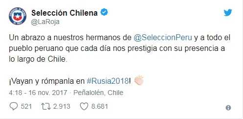 «Un abrazo a nuestros hermanos de la Selección de Perú y a todo el pueblo peruano que cada día nos prestigia con su presencia a lo largo de Chile. ¡Vayan a romperla en Rusia!», reza el mensaje que se publicó en la cuenta de Twitter oficial de La Roja.