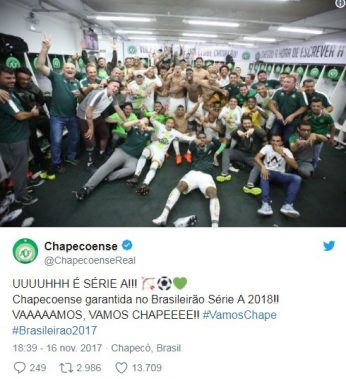 Con el triunfo, Chapecoense llegó a 47 puntos y garantizó matemáticamente su permanencia en el «Brasileirao» 2017. Uno de sus rivales directos en la lucha por la permanencia en la Primera División, Sport Recife, perdió 5-1 con Palmeiras y tiene 36 unidades.