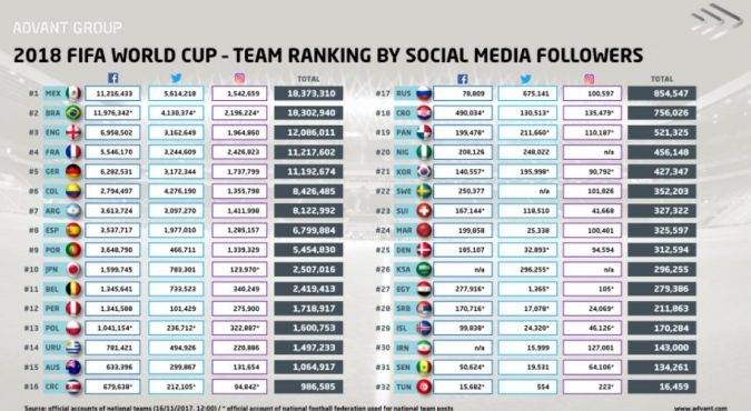 México encabeza el ranking de las selecciones con más seguidores a través de las redes sociales entre los 32 clasificados al Mundial de Rusia 2018.