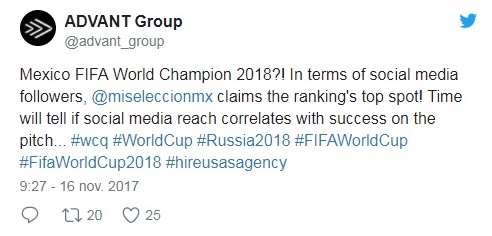 De acuerdo a un estudio publicado por Advant Group, la selección mexicana es el equipo más popular de Internet, cuenta con 18 millones 373 mil 310 seguidores en las tres plataformas sociales de Facebook, Twitter e Instagram.