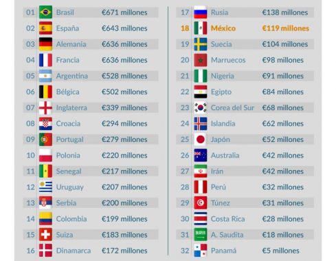 A esta lista le sigue el equipo francés, que está igualado con el alemán en 63 millones de euros. La Selección Argentina está en el quinto lugar con 528 millones de euros. El top 10 lo completan Bélgica (502), Inglaterra (339), Croacia (294), Portugal (279), y Polonia (220).