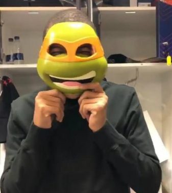 Aunque la máscara que recibió de obsequio era de Michelangelo eso no le impidió al chico posar con ella. La lució para que sus compañeros tomaran fotos y grabaran el vídeo, que consecuentemente, subieron a sus redes sociales. El vídeo ya se ha hecho viral.