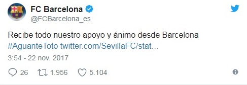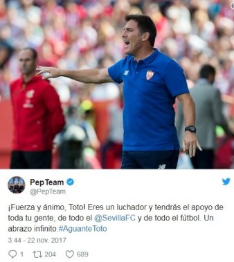 Uno de sus compañeros de profesión, Pep Guardiola, no ha tardado en mandar un mensaje a través de twitter. “¡Fuerza y ánimo, Toto! Eres un luchador y tendrás el apoyo de toda tu gente, de todo el @SevillaFC y de todo el fútbol. Un abrazo infinito. #AguanteToto” ha publicado el perfil oficial del técnico del City.