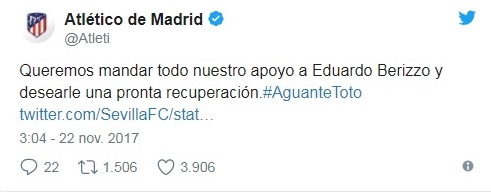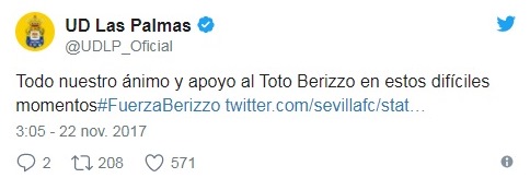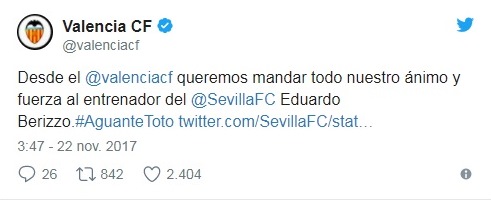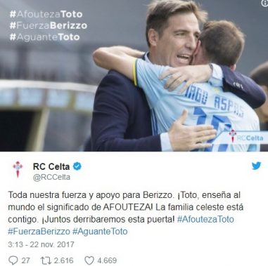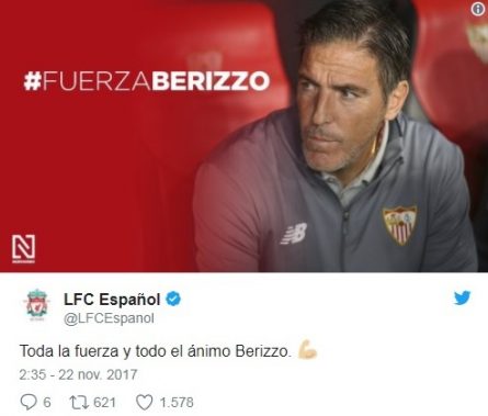 Berizzo no está solo. El técnico del club andaluz está recibiendo una aluvión de muestras de afecto y ánimo en las últimas horas. Con los hastag #ÁnimoBerizzo o #ÁnimoToto, las redes sociales se han llenado de mensajes de aficionados de todo el mundo.