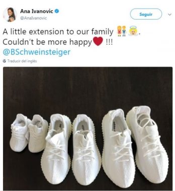 «Una pequeña ampliación de nuestra familia. ¡No puedo ser más feliz!», escribió Ivanovic en un mensaje acompañado de una fotografía de tres pares de zapatos de igual diseño, pero de diferente tamaño, para su marido, ella y el bebé.