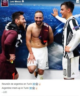 En las redes sociales se transformó en viral el encuentro entre Lionel Messi, Gonzalo Higuaín y Paulo Dybala, quienes podrían integrar la lista mundialista de cara a Rusia 2018. Hubo charla, risas y algo más en la antesala del cotejo que enfrentó a la Juventus y el Barcelona.