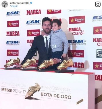 La esposa del crack compartió una fotografía en la que aparece Messi posando con su hijo Thiago con el trofeo