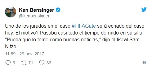 Así lo anunció el periodista de Buzzfeed, Ben Kensinger, quien sigue de manera especial la cobertura de este histórico juicio que salpica de corrupción al fútbol. Según este reportero que realizó investigaciones sobre la corrupción en FIFA, el jurado ya es conocido como el «jurado dormilón».