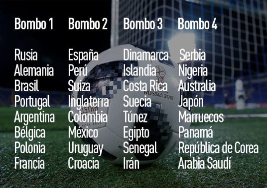 El pasado 16 de noviembre, la Federación Internacional de Fútbol Asociación (FIFA) anunció la composición de los bombos para el sorteo final. Las 32 selecciones clasificadas para el Mundial de Rusia 2018 fueron repartidas entre cuatro bombos por orden decreciente en base al ranking de la FIFA: los siete mejores equipos y Rusia, como país anfitrión, se colocaron en el bombo 1.