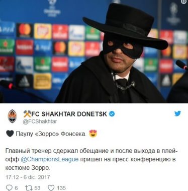 Paulo Fonseca, extrovertido entrenador del Shakhtar Donetsk, cumplió su promesa de disfrazarse de El Zorro después de clasificar al equipo ucraniano para los octavos de final de la Champions League, tras vencer 2-1 al Manchester City.
