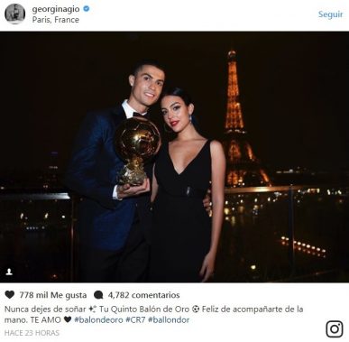 En una de las fotografías de la noche se ve a la pareja frente a la Torre Eiffel. Georgina acompañó la imagen en su perfil de Instagram con el siguiente texto: «Nunca dejes de soñar ✨ Tu Quinto Balón de Oro ⚽️ Feliz de acompañarte de la mano. TE AMO».