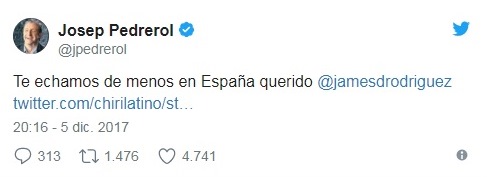 El reconocido periodista Josep Pedrerol, conductor de «El Chiringuito», señaló que en España lo echan de menos. «James es estelar, qué bueno es el colombiano. ¡Que vuelva ya, por favor!», dijo Pedrerol en su programa.