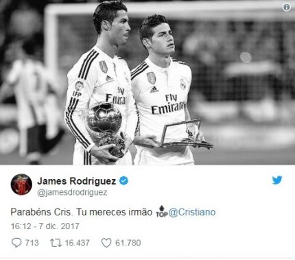 El delantero portugués Cristiano Ronaldo ganó su quinto Balón de Oro e igualó a Lionel Messi en este galardón. El centrocampista colombiano James Rodríguez quien durante su estadía en el Real Madrid hizo muy buena amistad con CR7, le envió una felicitación vía Twitter que se viralizó.