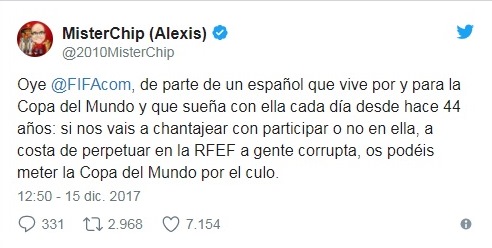 Como consecuencia, «MisterChip», que se caracteriza por el manejo de datos y estadísticas, utilizó su multitudinaria cuenta de Twitter para publicar un mensaje muy picante contra la FIFA.