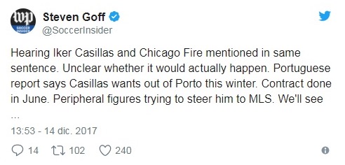 La web de la MLS cita a Steven Goff, periodista de The Washington Post, que publicó la siguiente información: «Escuchando a Iker Casillas y al Chicago Fire en el mismo enunciado. No está claro si efectivamente sucederá. Los reportes desde Portugal indican que Casillas quiere salir del Porto esté invierno. Su contrato vence en junio. Figuras en el entorno tratando de llevarlo a la MLS. Ya veremos…».
