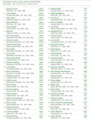 El CIES Football Observatory realizó un estudio para colocar en un ranking a los futbolistas mejor valorados. Neymar Junior se encuentra en la cima, le sigue Lionel Messi y en el puesto 49 Cristiano Ronaldo, superando solo a figuras como Carrasco y Bakayoko.