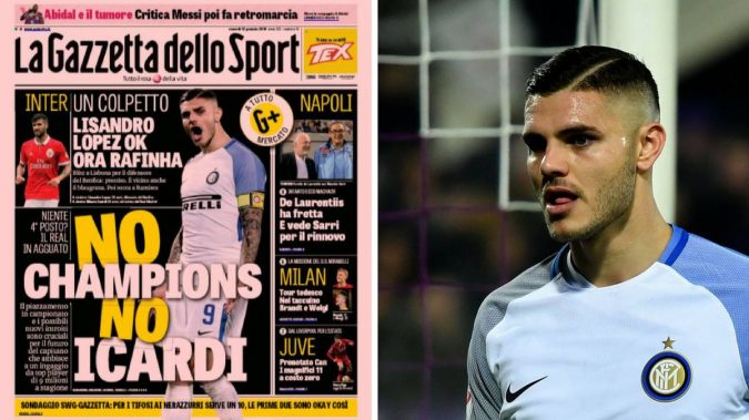 La Gazzetta dello Sport publica en su portada de hoy que Mauro Icardi podría irse del Inter de Milán si no se alcanzan cierto objetivos. Titula así: «No Champions, no Icardi». La idea es ampliar el contrato del futbolista argentino hasta 2023, incrementando su sueldo hasta llegar a los nueve millones de euros.