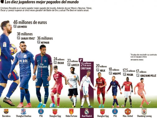 El Shanghai Shenhua pagaba a Carlos Tévez 38 millones de euros por temporada poco menos que, como el propio jugador ha reconocido recientemente, al rescindir su contrato con el club chino, por estar «de vacaciones». El caso de El Apache no es aislado. Otros dos jugadores, el brasileño Oscar y el argentino Lavezzi, superan en el gigante asiático las ganancias anuales de Cristiano, con 24 y 23 millones de euros, respectivamente. Y Hulk (20 kilos anuales) le pisa los talones. Como, de vuelta a Europa, un jugador recién llegado a la élite, Kylian Mbappé, que gana 18 kilos al año en el PSG. Todos ellos conforman el ranking que enfada a Cristiano, y que puede hacer que la aventura del luso en el Madrid acabe antes de tiempo.