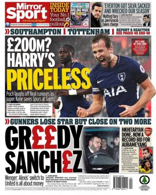 El Mirror, por su parte, interpreta las palabras de Pochettino de manera rotunda: «¿200 millones de libras? Harry no tiene precio», titula hoy lunes el tabloide en su portada de deportes.