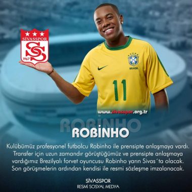 El Sivasspor, recién ascendido a la Superliga y flamante campeón de la segunda división, anunció su contratación. «Hay un principio de acuerdo, y el delantero llegará mañana a Sivas para firmar su contrato una vez que se lleven a cabo las últimas conversaciones», comunicó el club en un comunicado en su sitio oficial acompañado de una foto del atacante con la camiseta de la selección brasileña.