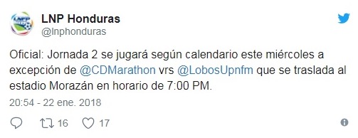 La segunda fecha del torneo Clausura 2017-2018 de la Liga Nacional de Honduras, programada para mañana miércoles, sufrió cambios en un partido.