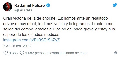 En principio, y si todo evoluciona de forma satisfactoria, Falcao estaría para los partidos amistosos que jugará Colombia ante Francia y Australia, los días 23 y 27 de marzo.