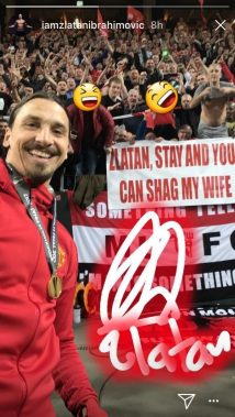 Ibrahimovic se acercó a un grupo de hinchas que sostenían la pancarta. En ella se podía leer: «Zlatan, si te quedas en el Manchester United puedes acostarte con mi esposa». Oferta de un hincha eufórico por el título que le permitirá al equipo de José Mourinho jugar la próxima Champions League.