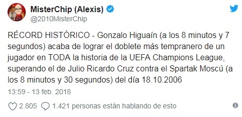 En ese mismo partido, Higuaín también pudo firmar un triplete antes de los primeros 45 minutos. Sin embargo, el exjugador del Napoli erró el segundo penal del juego al estrellar su remate en el travesaño. Eso impidió que rompiera otro par de récords en la Champions. El fallo lo metió en una corta lista de jugadores que anotaron dos goles y luego botaron un penal en el mismo partido.