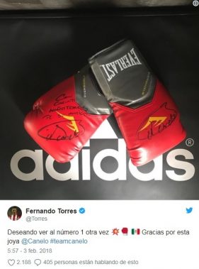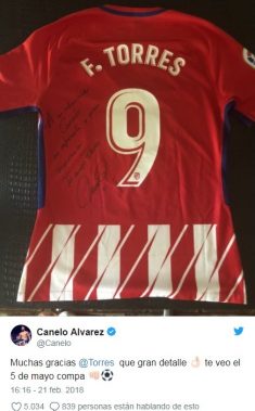 El futbolista le envió al pugilista su camiseta firmada y en el dorsal de la misma se podía leer el siguiente mensaje: «A mi admirable Canelo, un referente y gran inspiración». Tu amigo F. Torres». Con esto quedó finalmente en evidencia el respeto que existe entre los representantes del balompié y el pugilismo internacional.