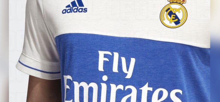 La camiseta de Adidas tiene una franja ancha azul que cruza el pecho. Esto es similar a la banda que cruza el escudo del equipo Real Madrid. Además tiene detalles azules en mangas y cuello.