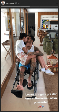 Ahora el delantero de Paris Saint Germain subió una historia a Instagram donde se lo puede ver paseando junto a su novia, la modelo Bruna Marquezine. En la imagen se aprecia como el crack brasileño pasea a su pareja en silla de ruedas.